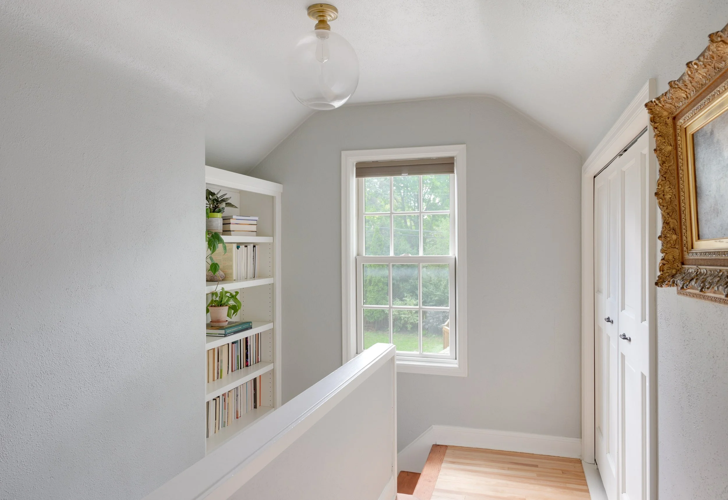 The woodwork including windows, trim and doors was taken from a dark stain to a brilliant white completely transforming the space. The homeowner chose Sherwin Williams Pure White in a satin finish.